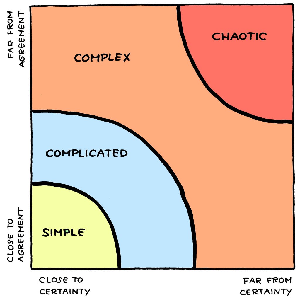 - Chaotic: Chaotic projects lack agreement among stakeholders, and cause-and-effect relationships are unpredictable. Immediate action is necessary to stabilize the situation before moving forward.